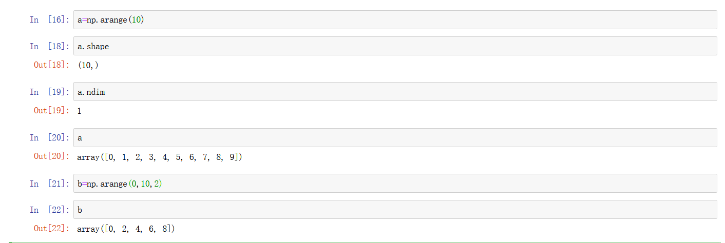 numpy里面也有像Python range()函数一样的效果——np.arange(),操作效果和Python的range函数有异曲同工之妙,start,stop,step都是可设置的。