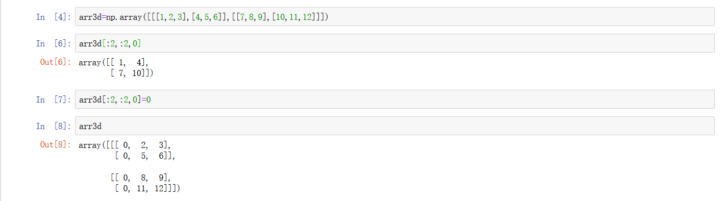 很明显的我们可以看出多维数组的切片特点:我这里抽象化为列表的特点来解释,比如我们可以把多维数组看做是一个列表里面的多个列表,也就是嵌套列表,然后我们按照索引来取,上述例子就是首先取出两个大的数组,然后从这个两个大的数组里面再去前两个数组,最后取出索引为0的元素,这样层层递减,一步一步的索引是numpy索引的特点,之所以大数据技术之分析与计算,要用到矩阵计算的优化,就是来源于它的分而治之的原理和特点。