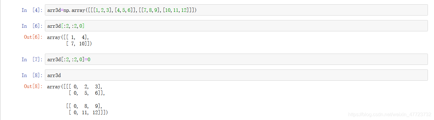 对于高维的数组的切片,我们需要注意的是,它的切片原理是按照数组里面的数组进行切片的,比如一个二维数组(2*3*2)的,我们需要取出每个单位数组里面的第一个元素,我们应该如何做