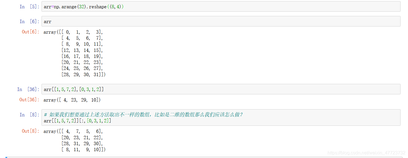 我们需要索引出不同位置的数组,这个时候我们还在一个一个的取出来吗,当然不是我们可以利用特殊的索引来解决这个问题,比如下面的例子
