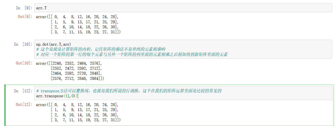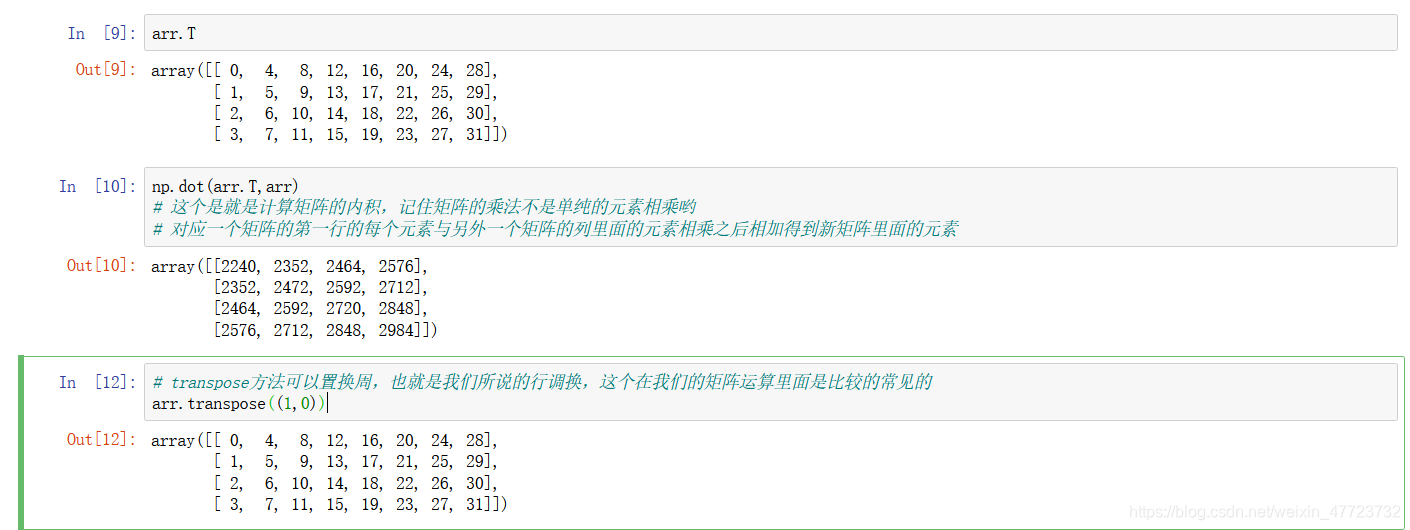 我们随机生成一个0-15的元素组成3*5的一个数组,然后利用.T属性,如果学过线性代数的小伙伴一定对这个不陌生,矩阵的转置:把行变成列,把列变成行。