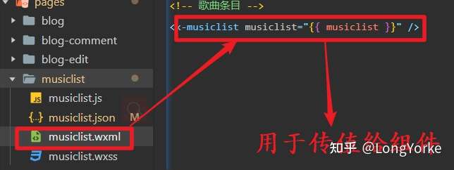 之前我们是使用block标签遍历L-playlist组件将playlist数组的元素一个一个传入组件playlist中,这次换一种方式:将整个列表传入歌曲列表组件musiclist,从而对整个传入的列表进行操作