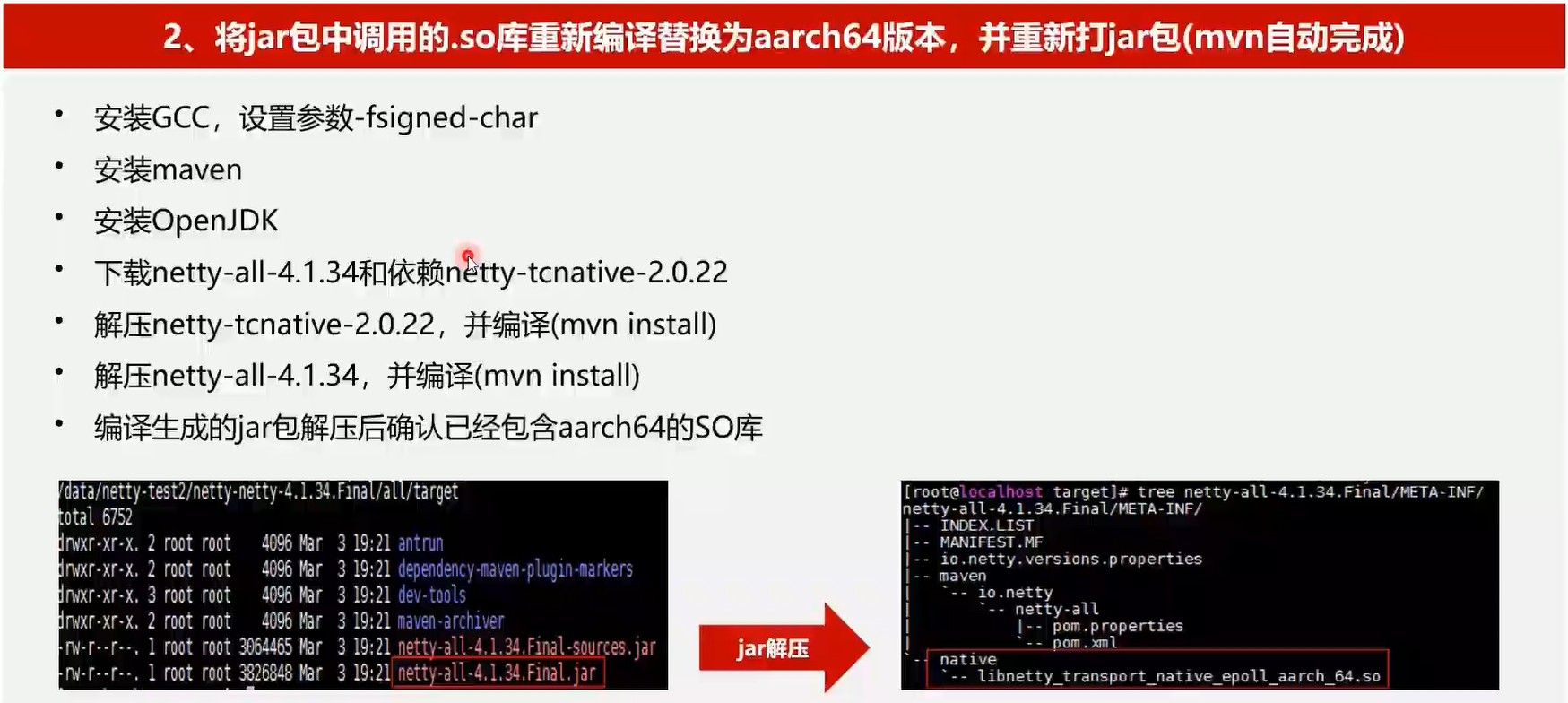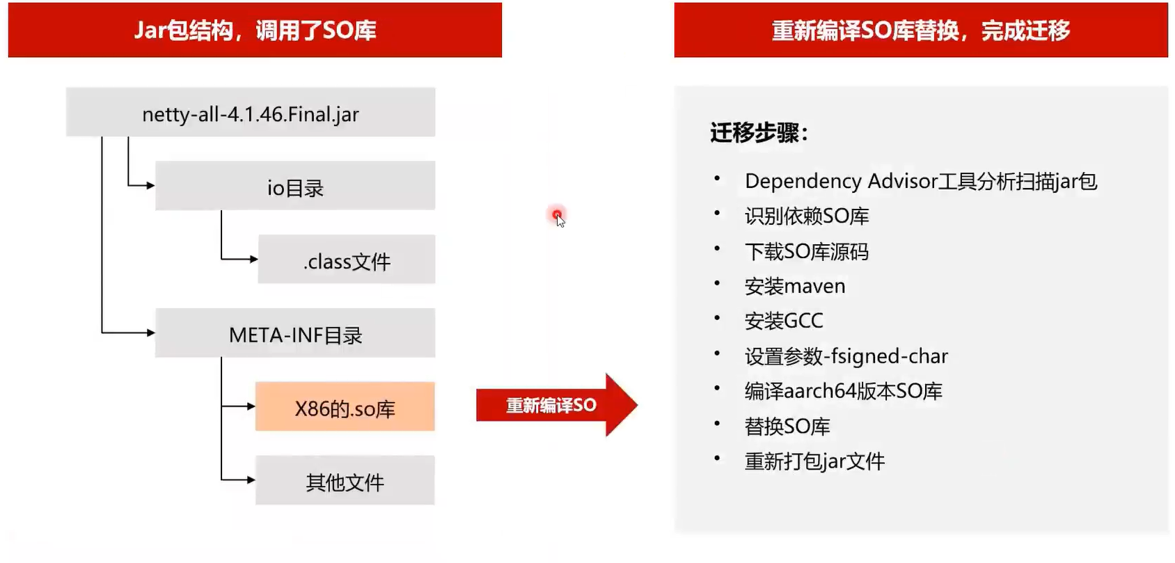 - 调用跟SO库的jar包或模块,需要替换aarch64 版本的SO库才能正常使用