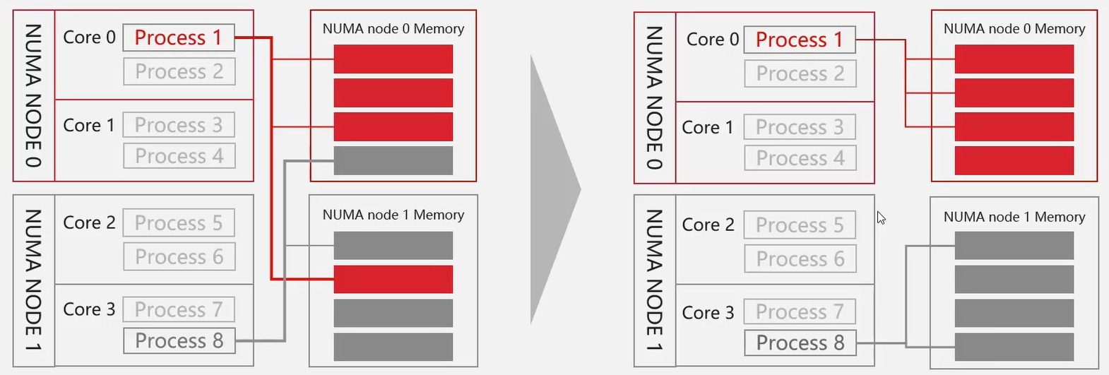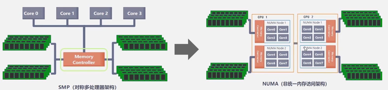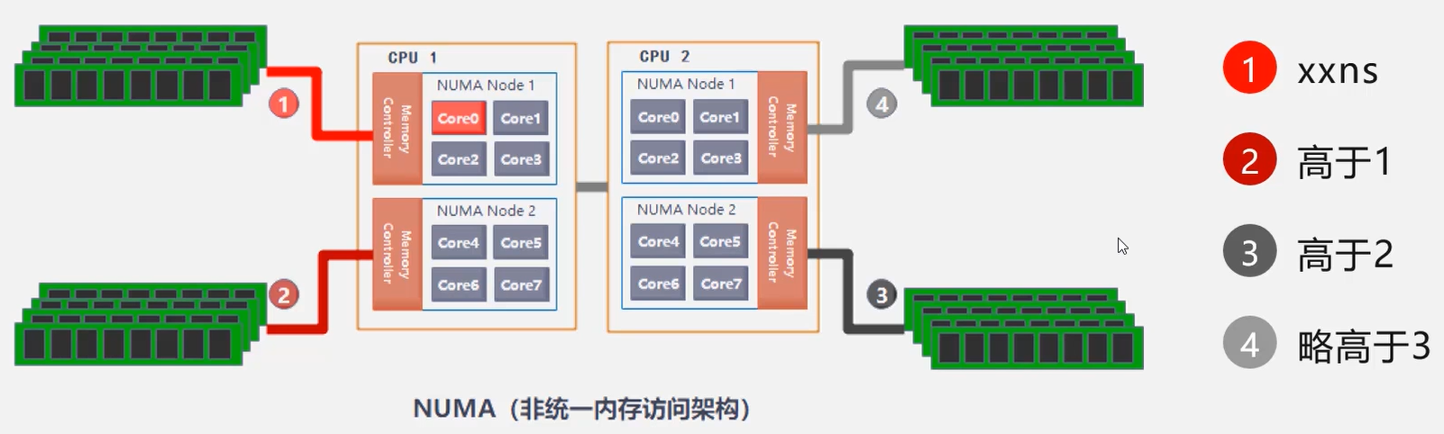 - 在SMP系统中,核数的扩展收到内存总线的限制。非统一内存访问架构(Non-uniform memory access)很好的解决了这一问题