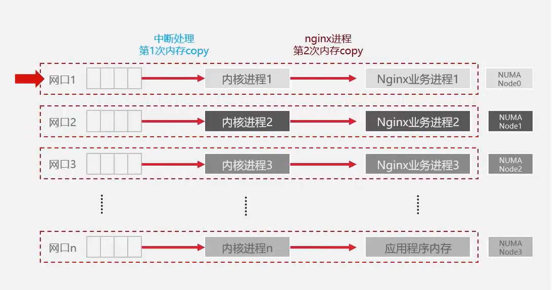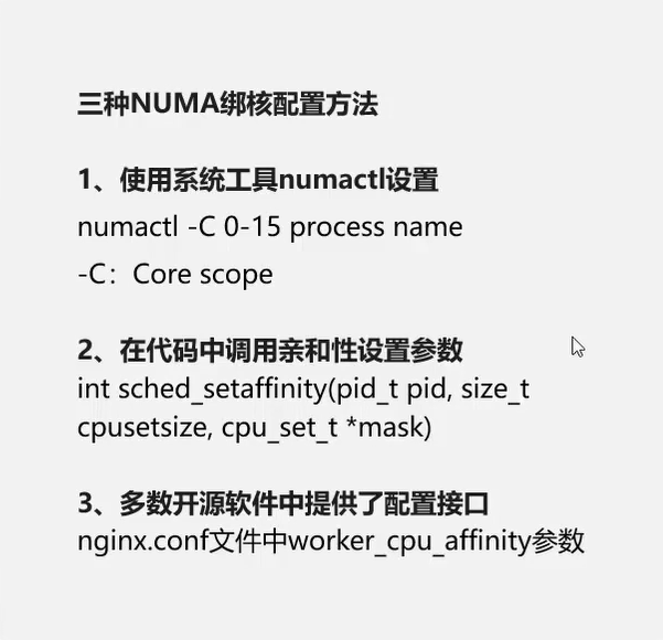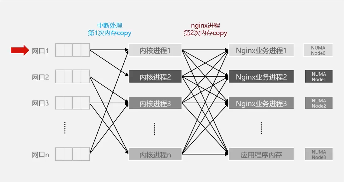- Nginx绑核优化举例(将Nginx进程分不到各个NUMA node之内,让系统整体的负载比较均衡,按照中断号将中断服务核Nginx绑定在一个NUMA内。性能将会有非常明显的提升)