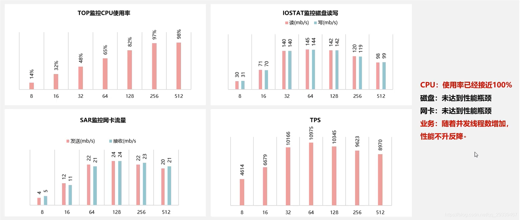 - 对于本测试用例中的热点函数分析如下:随着并发线程数的增多,CPU的时间片集中在了锁的争抢中,这部分无用功造成了CPU资源的浪费