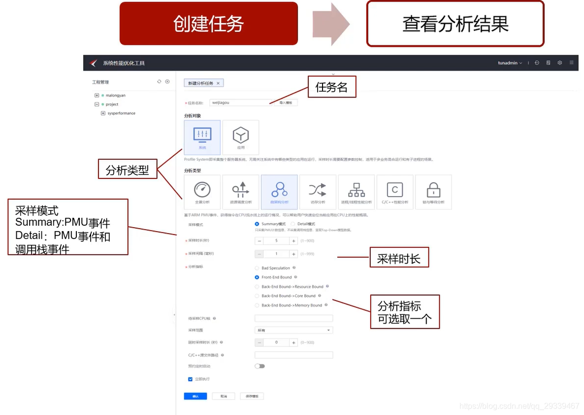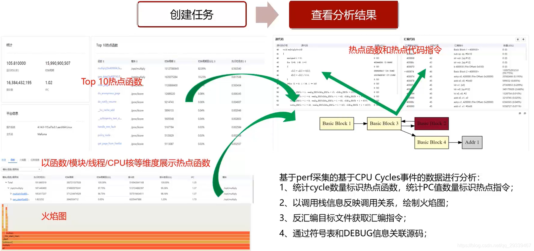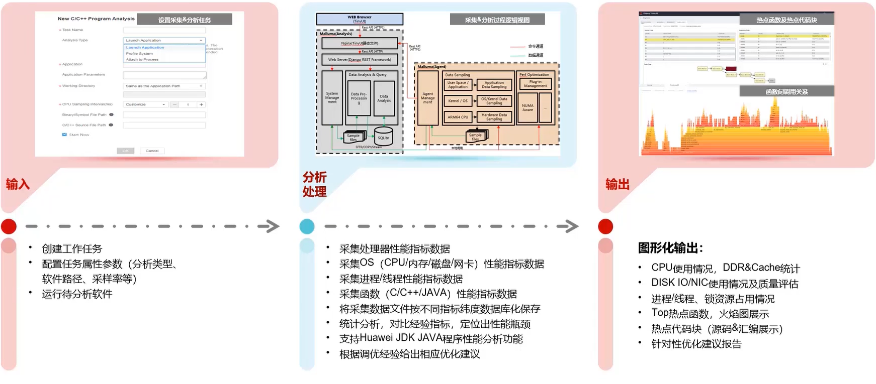 - 功能:系统性能数据采集和分析,分析出系统性能指标,定位到瓶颈点及热点函数,给出调优建议