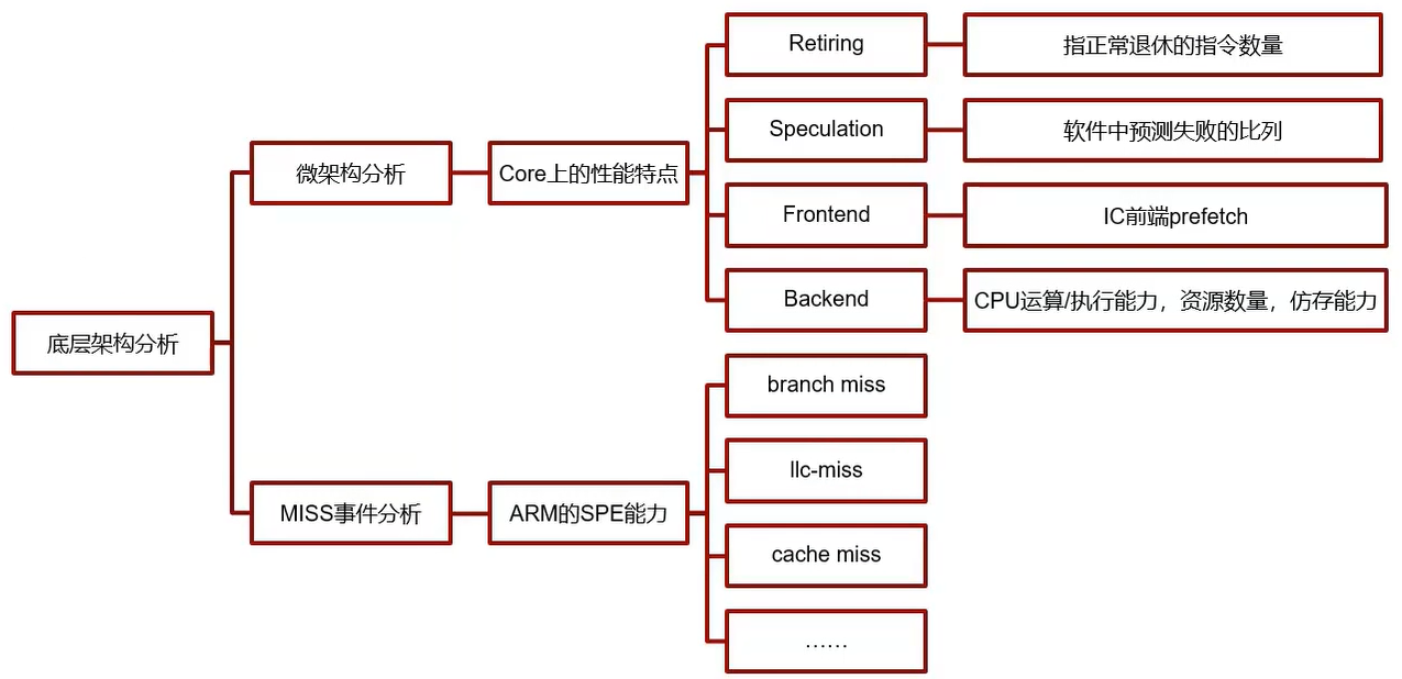 - 底层架构级分析定义为采集整个系统(包括运行中的进程或直接启动的进程)的硬件PMU性能事件,然后按照CPU微架构的特点划分为不同层级及关键指标,提供用户快速定位当前应用在CPU上或者uncore上的性能瓶颈,更加方便地针对性地修改自己的程序,以充分利用当前的硬件资源