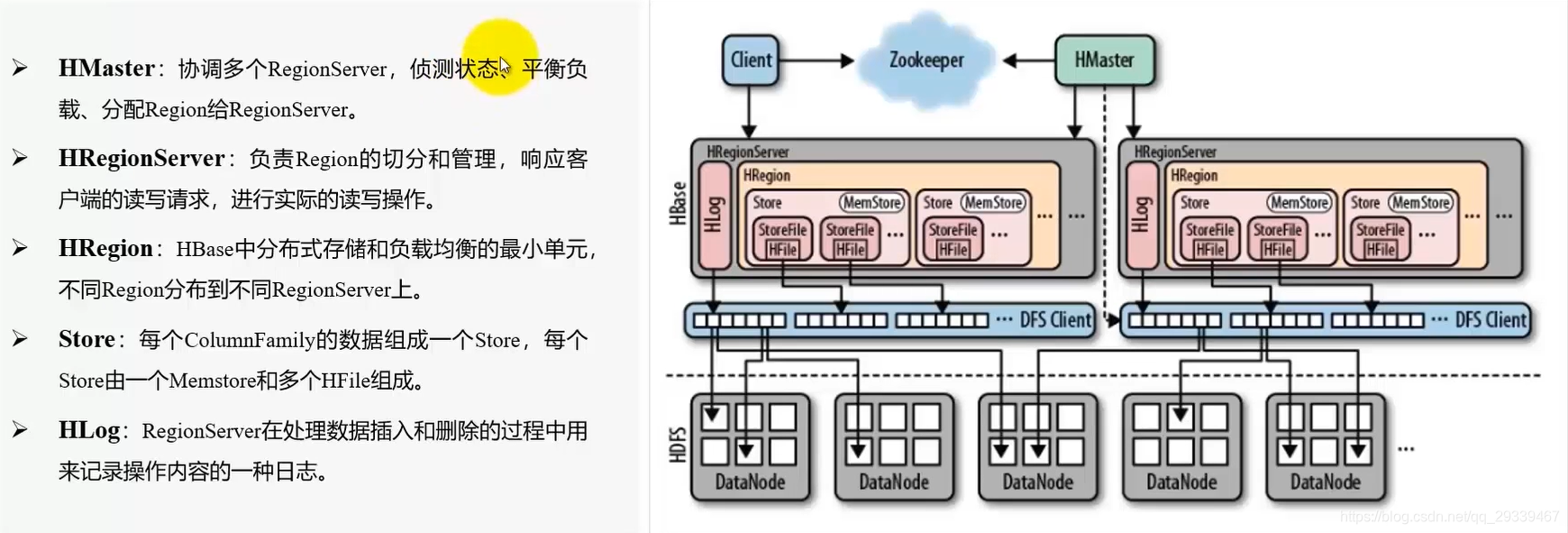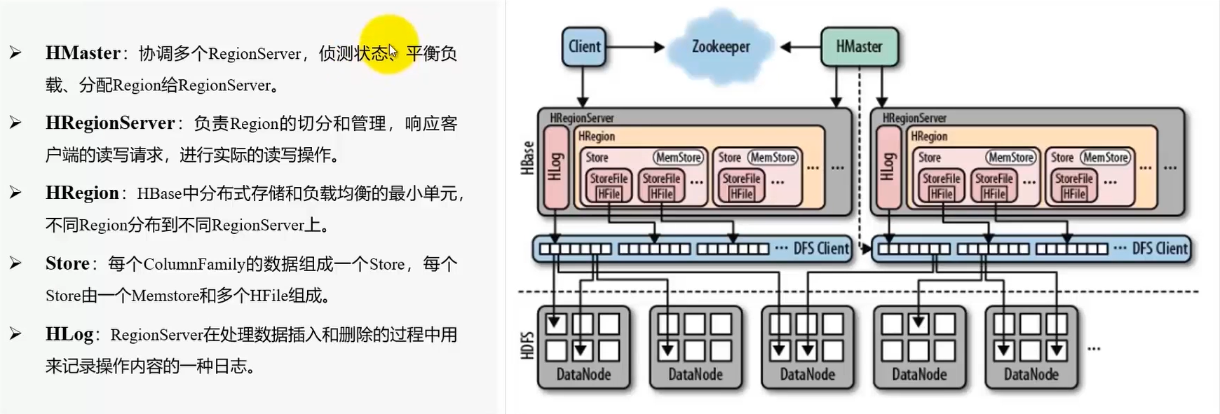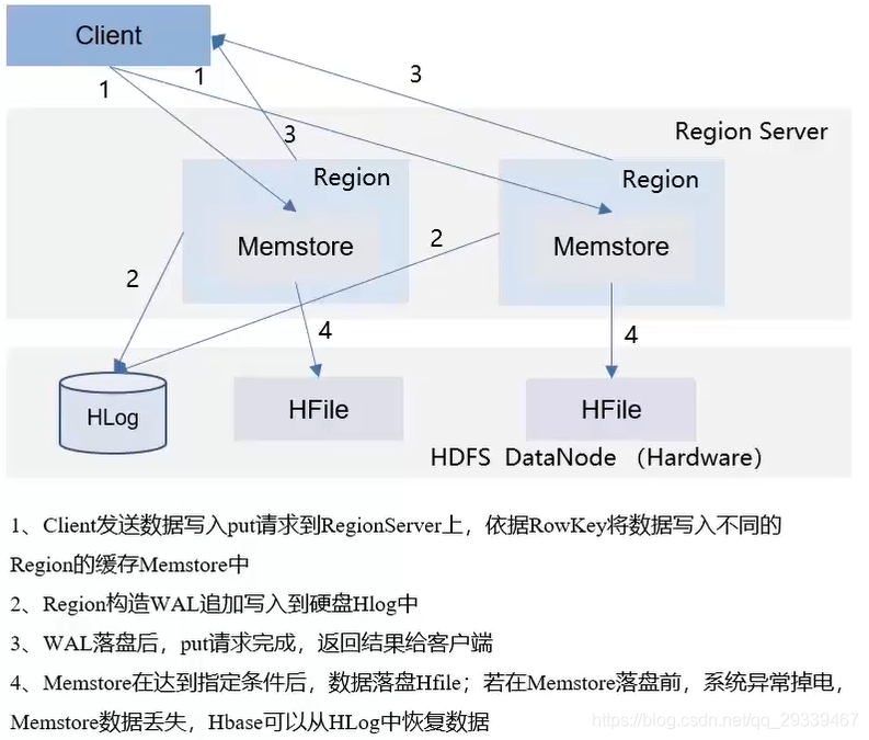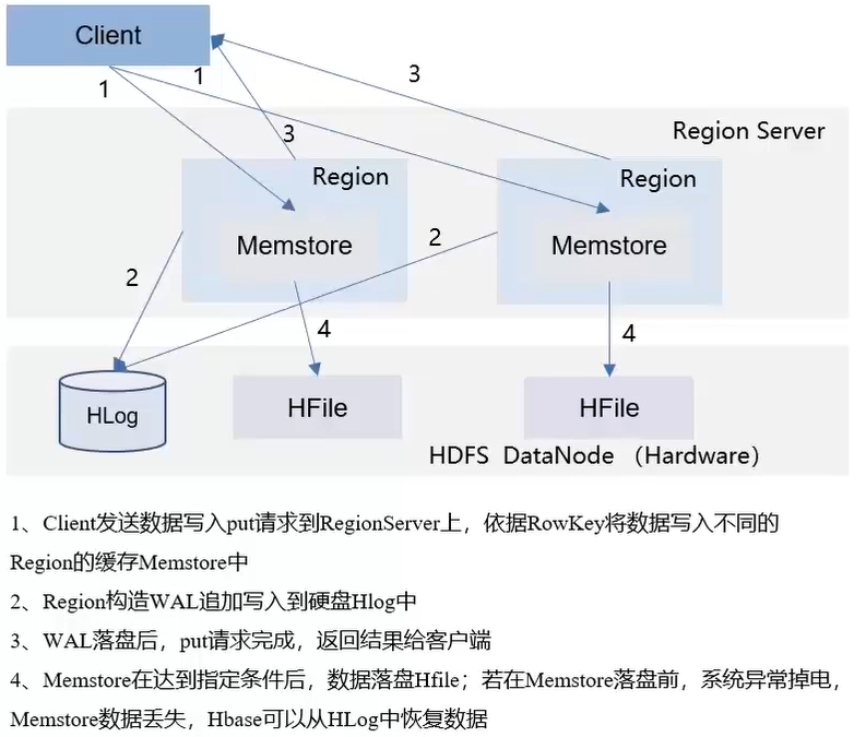 写入流程:优先写入Memstore内存区域,加速写入速度,HLog保障数据可靠