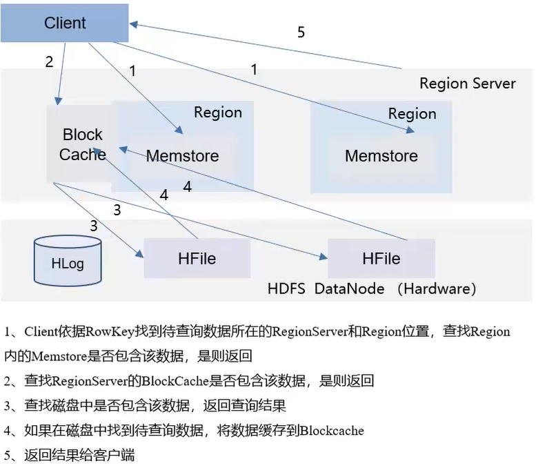 读取流程:依次从Memstore和BlockCache查找数据,若未命中,再从磁盘查找