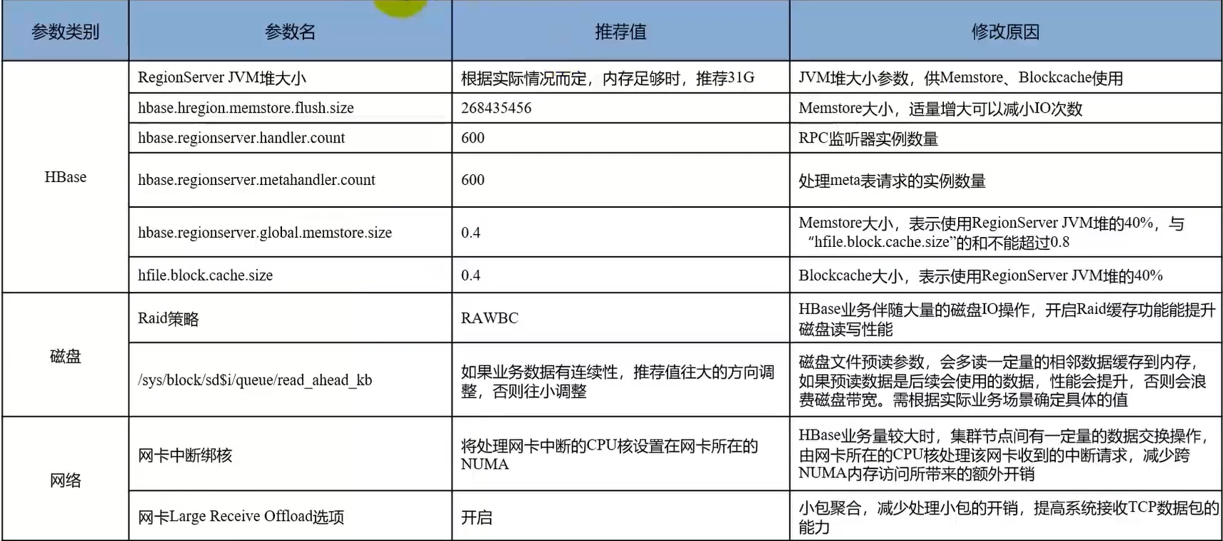 调优建议:适当增加MemStore核BlockCache容量来提升读写性能,同时优化磁盘IO和网络IO