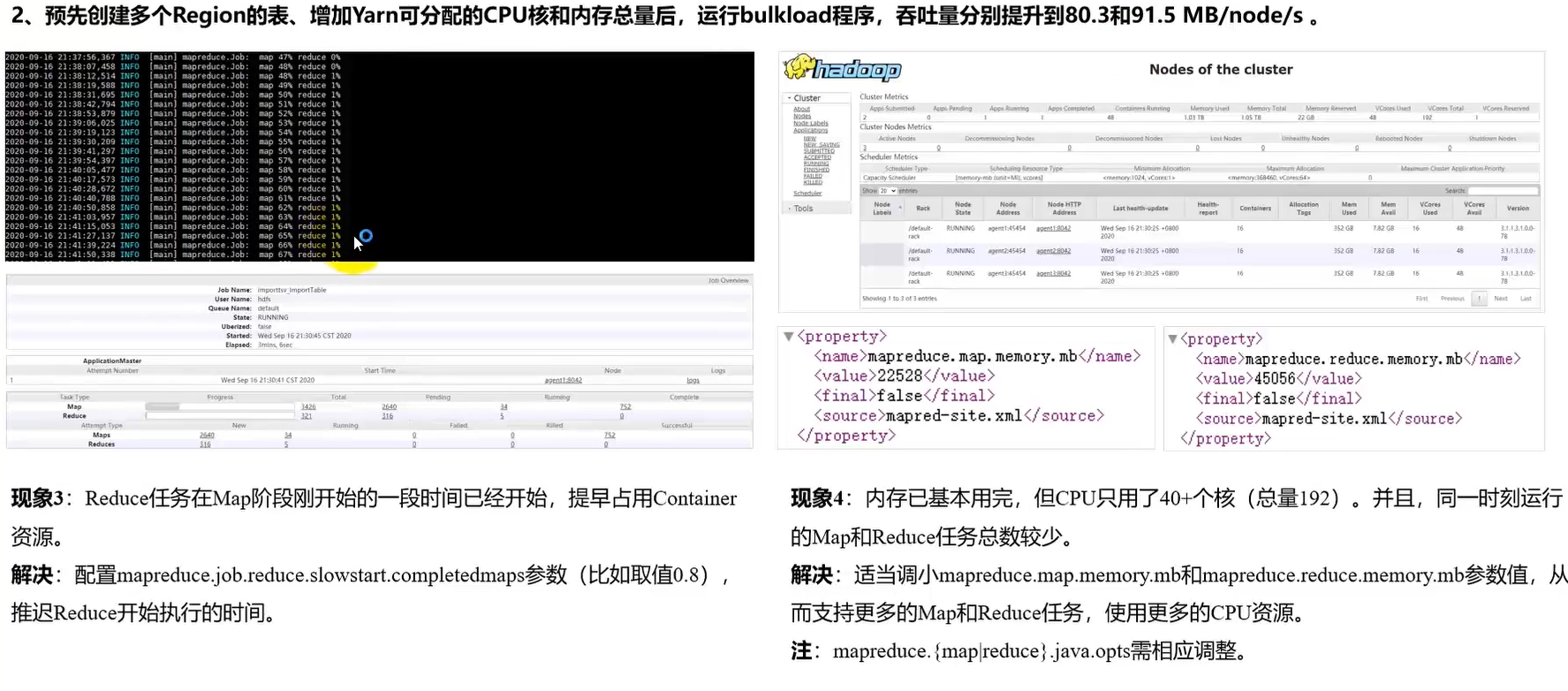 调优建议:适当调整Map核Reduce任务的数量与Reduce任务启动的时间,保证总任务数能覆盖到所有CPU核,避免资源浪费