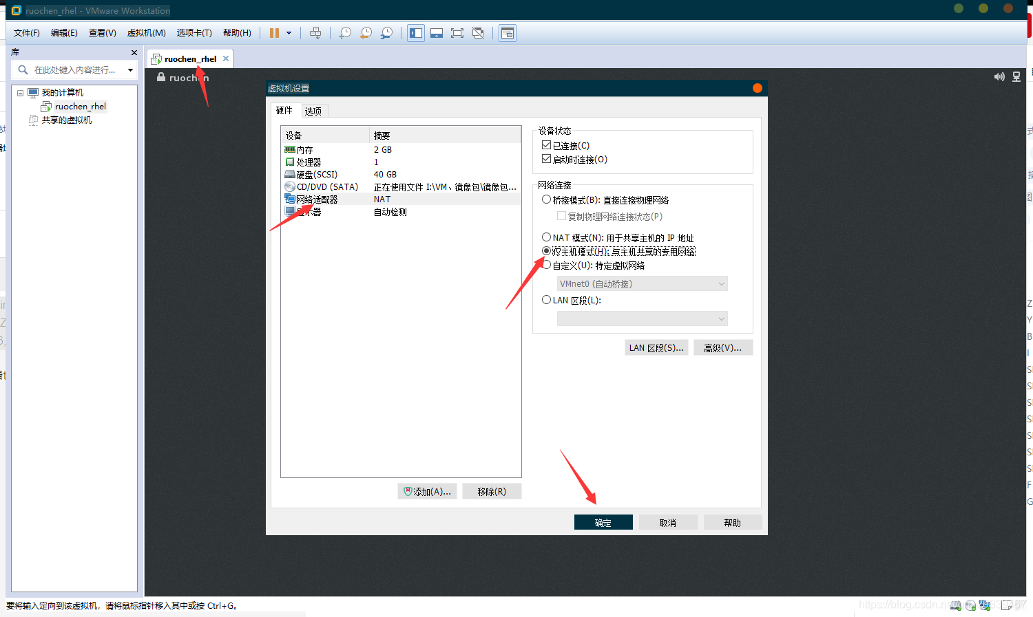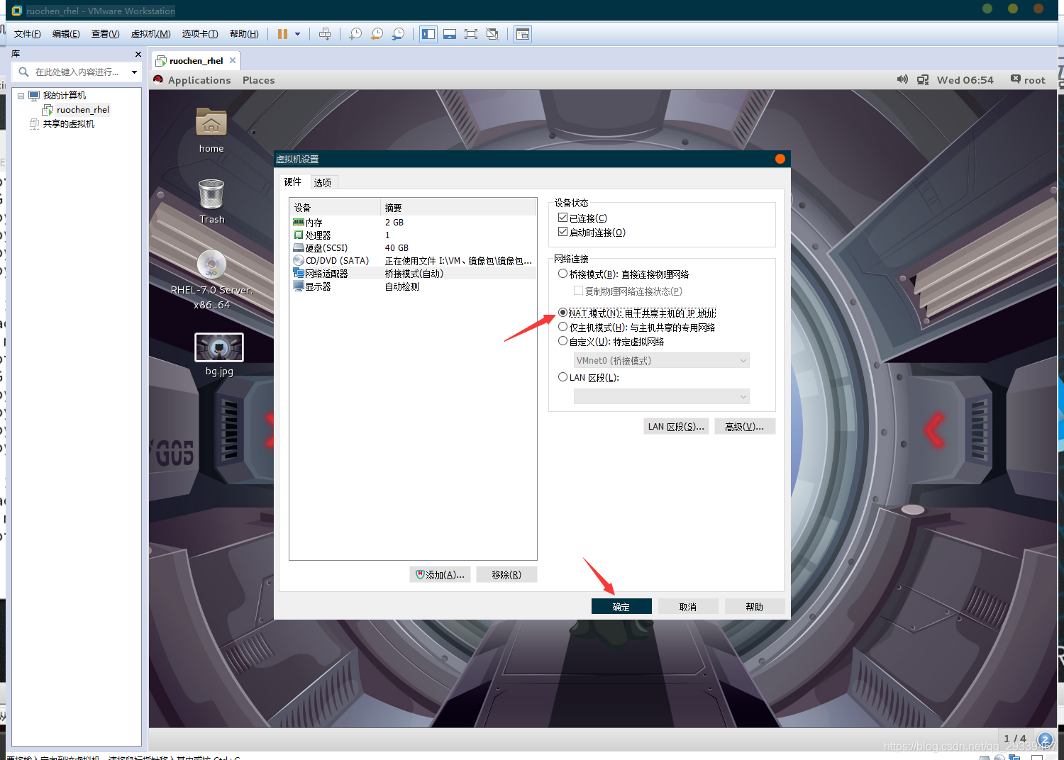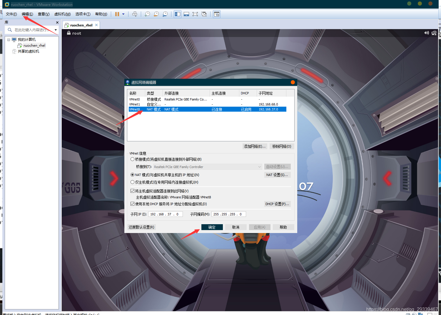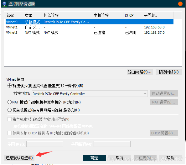 - 虚拟网络编辑器和虚拟机网络适配器都选择为