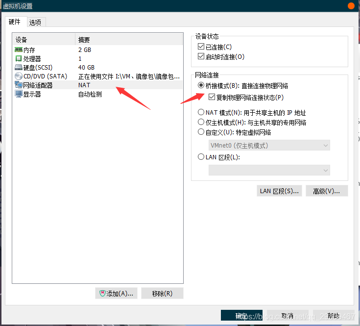 网络适配器选择为桥接模式