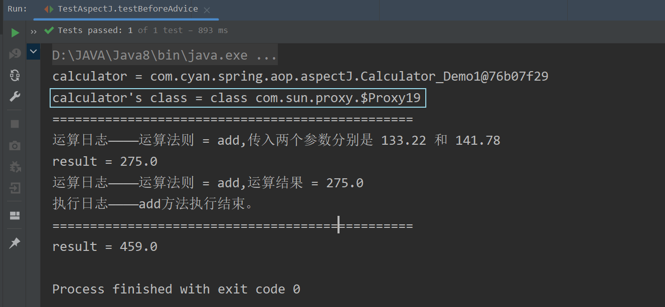 这时,再次运行刚才的测试方法,会发现Calculator_Demo1类和Calculator_Demo2类都可以成功获得代理对象,并且配置的@Before前置通知也成功执行,运行结果如下图所示 :