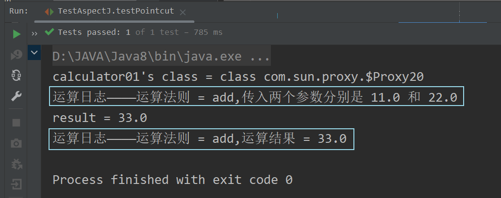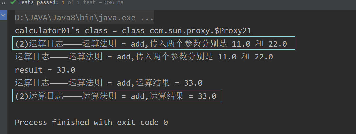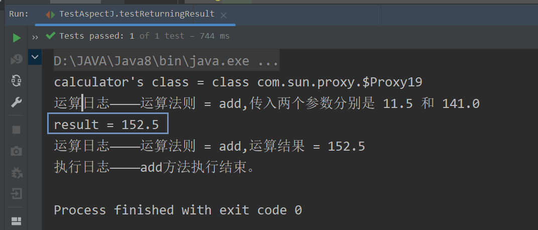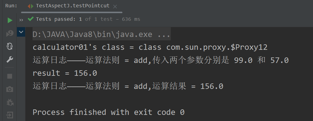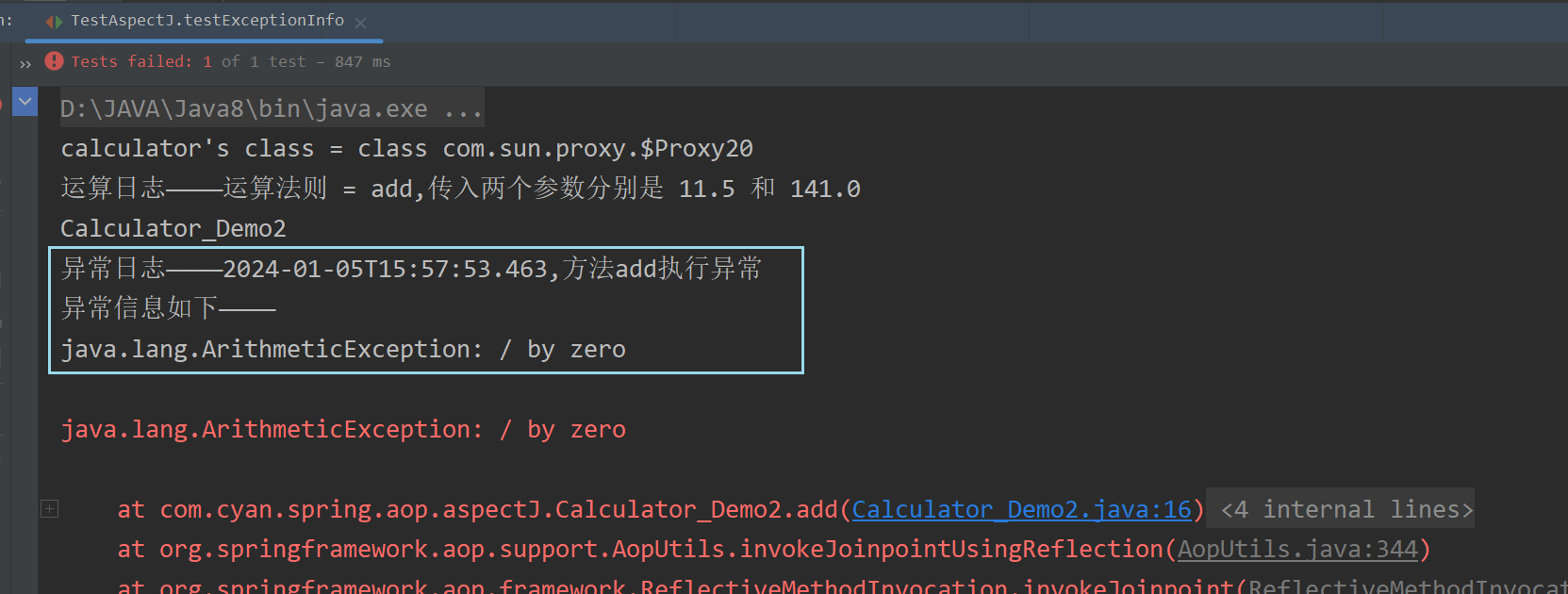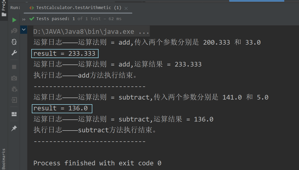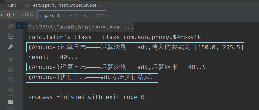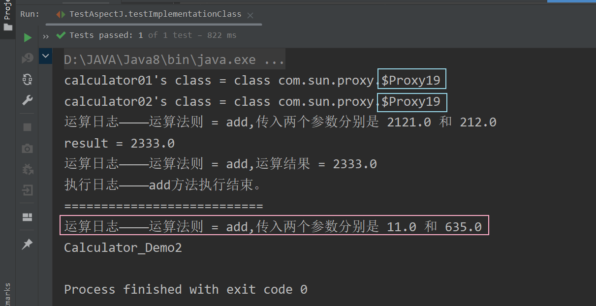 可以看到,此时新配置的切面类CalculatorAspect2的执行优先级更高;这时我们重新运行测试方法,运行结果如下 :