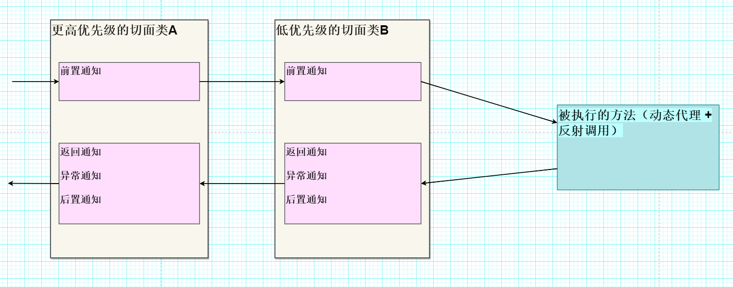 (2) 多个切面类的执行顺序,其实和FilterChain过滤器链的执行顺序是十分相似的,即后调用的先执行完毕,如下图所示 :