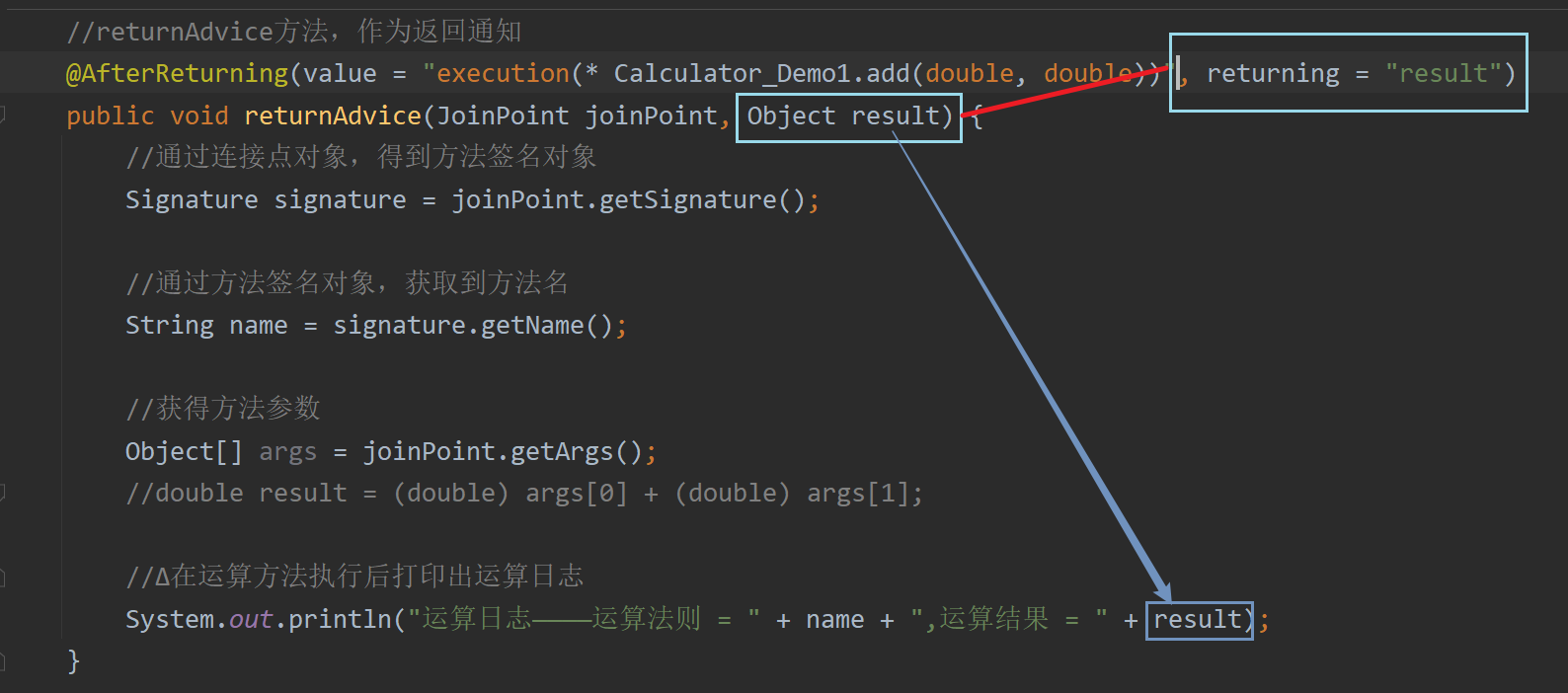 在使用@AfterReturning注解配置“返回通知”时,可以在配置切入点表达式后,额外通过returning = "表示返回结果的变量"来定义方法的返回结果,但需要在切入方法的形参列表中,同时也额外定义一个相同名称的变量。如下图所示 :