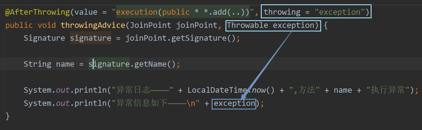 在使用@AfterThrowing注解配置“返回通知”时,可以在配置切入点表达式后,额外通过throwing= "表示异常信息的变量"来定义方法的异常信息,但需要在切入方法的形参列表中,同时也额外定义一个相同名称的变量(注意变量的类型)。如下图所示 :