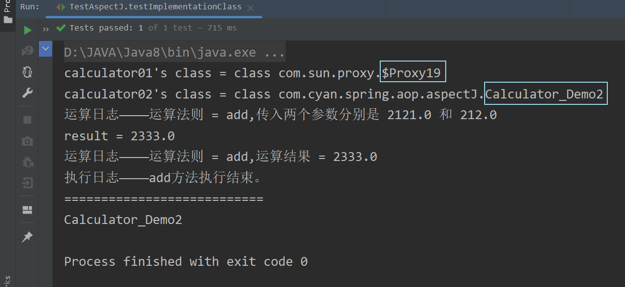 可以看到,只有Calculator_Demo1类成功得到了代理对象,且配置的切入点表达式也执行成功,而Calculator_Demo2类却仍然只是一个实现类对象。