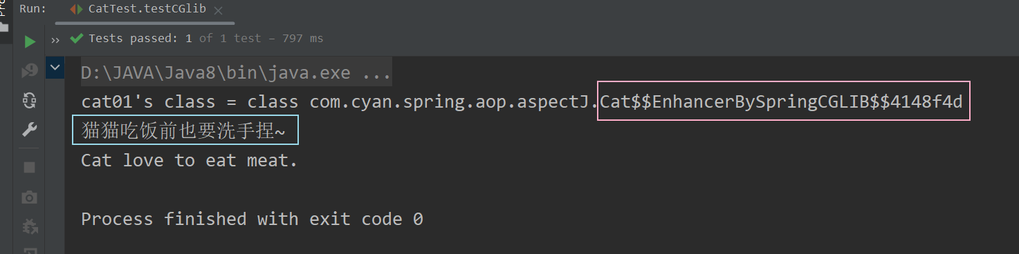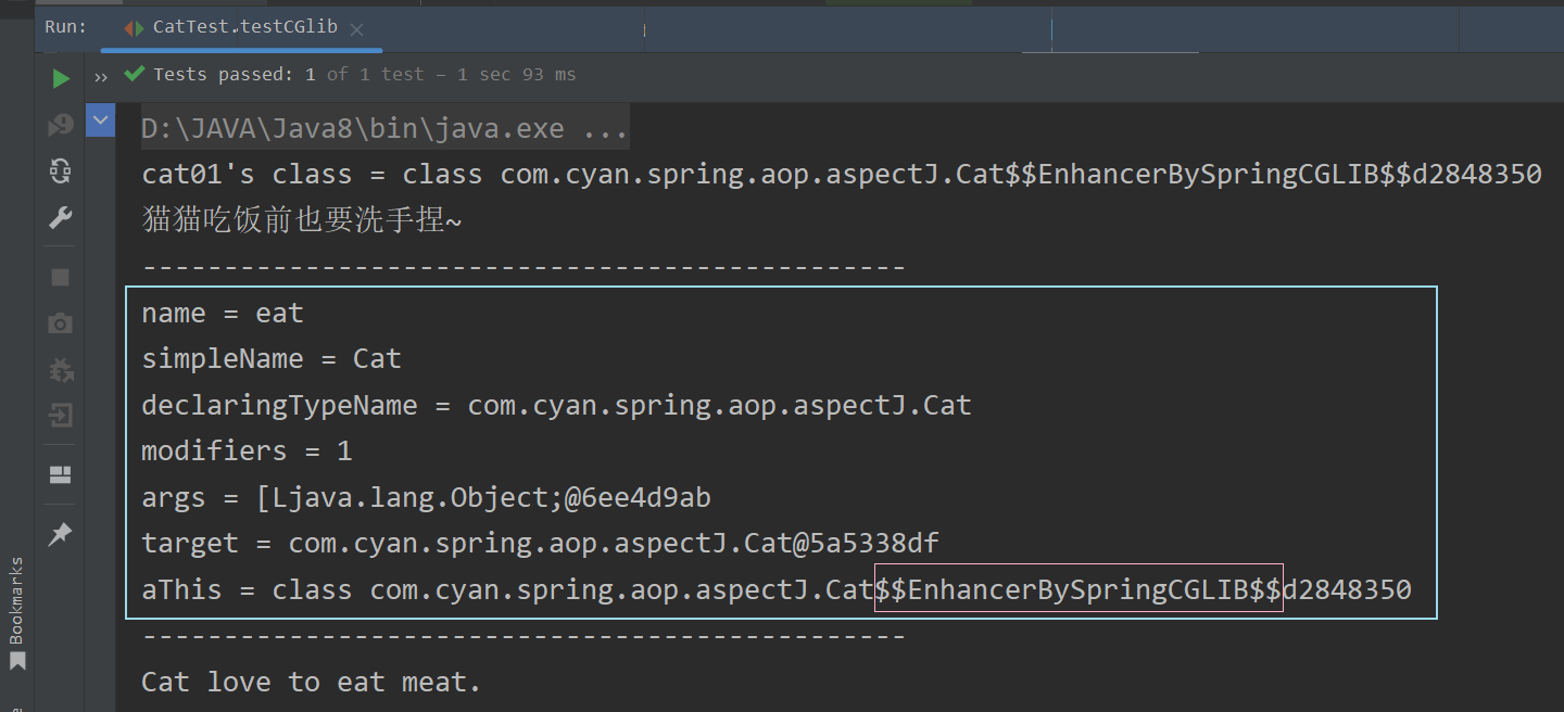 最后,再定义一个简单的测试类,测试CGlib动态代理是否生效,CatTest类代码如下 :