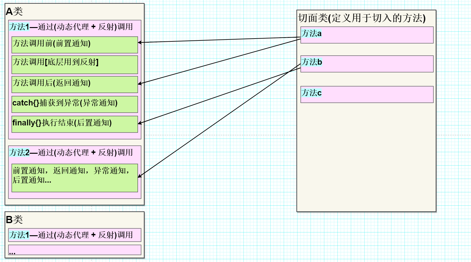但是在AOP,我们是通过 “动态代理 + 反射” 的形式来调用类中的方法,那么类中的方法在执行过程中会被分为多个横切关注点,包括前置通知,返回通知,异常通知,后置通知。我们可以定义切面类,切面类中定义了用于切入的方法,通过注解配置,这些方法可以切入到任意支持AOP的类的任意方法的横切关注点。如下图所示 :
