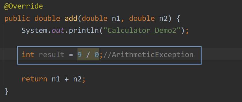 我们可以在Calculator_Demo2类的add方法中,故意制造一个算术异常,如下图所示 :