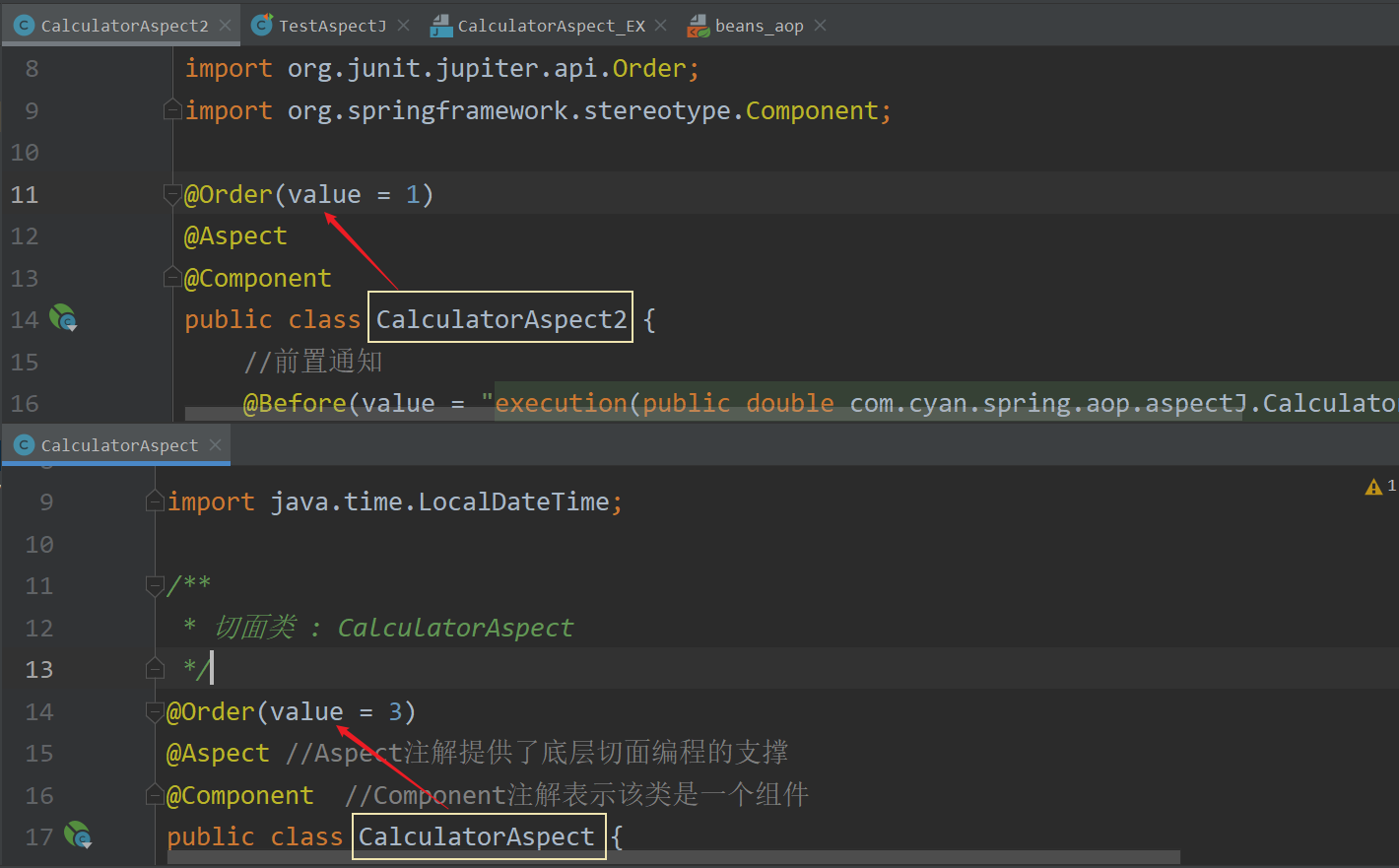 可以看到,当前是旧的切面类先生效;现在,我们给两个切面类都配置上@Order注解,如下图所示 :