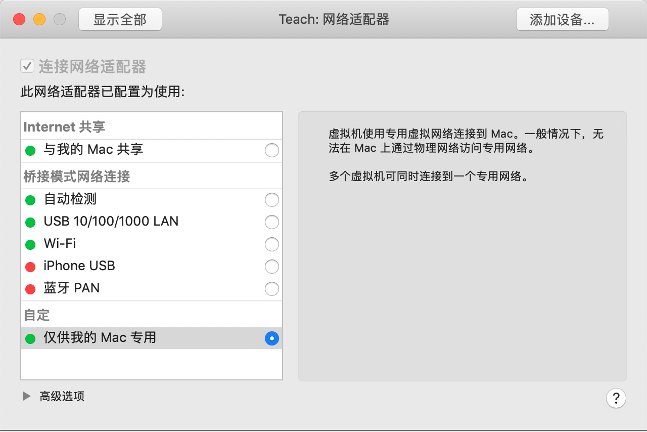 仅主机模式与NAT模式的主要区别就是没有了虚拟NAT设备,表面上看就是将虚拟机与外界完全隔离,不接入外网,只能与宿主机进行数据交互。如果一定要使得仅主机模式的虚拟机接入互联网,也可以通过设置网卡共享的方式实现。