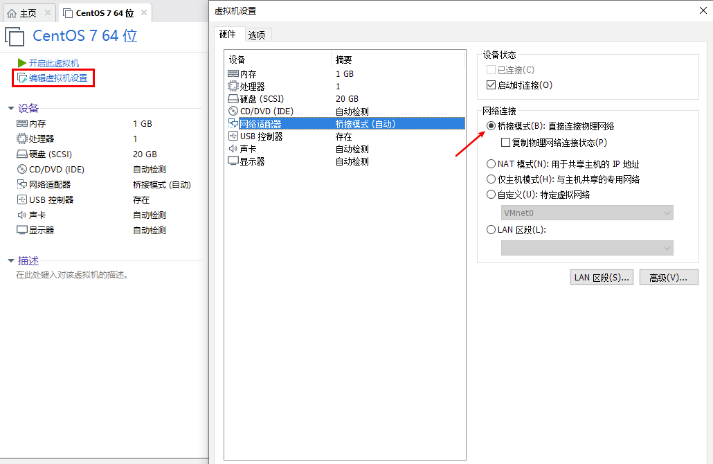 点击虚拟机设置 - 选择网络适配器 - 选择桥接模式