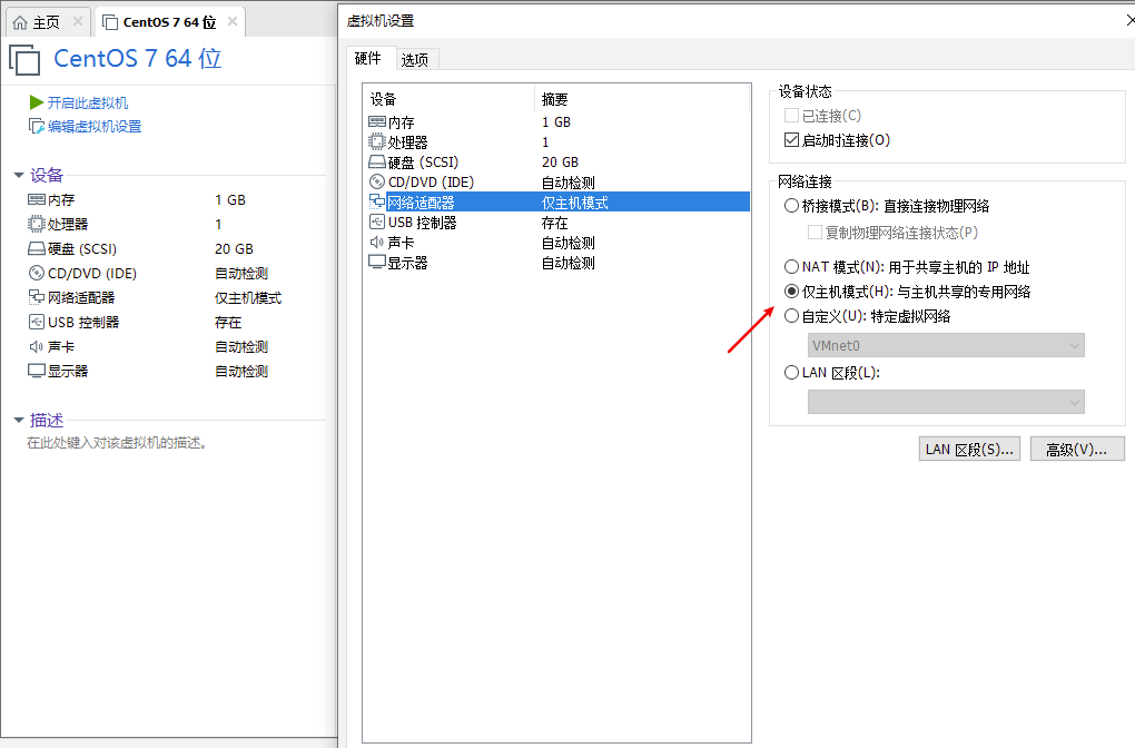 点击虚拟机设置 - 选择网络适配器 - 选择仅主机模式