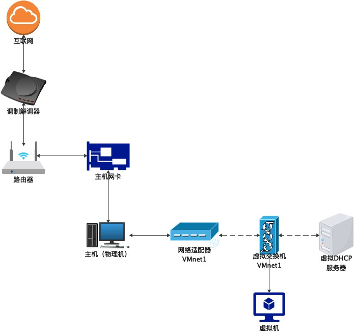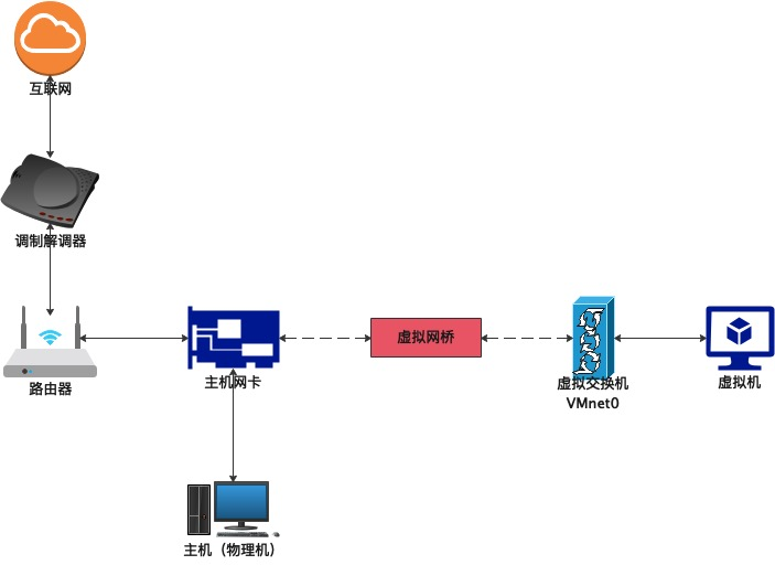 使用虚拟网桥与宿主机物理网卡连接,所以可以直接接收到由主机连接的路由器发出的DHCP等信息。在这种模式下,如果虚拟机使用桥接模式(即通过VMnet0)来上网,那么虚拟机中的网络设置必须与主机一致,包括网关、IP地址网段、子网掩码。