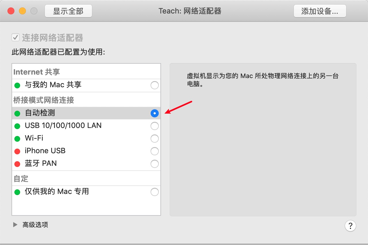 选择桥接模式下的自动检测或当前接入网络的网卡