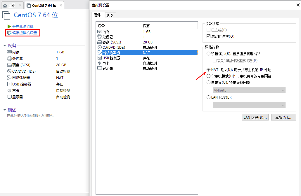 点击虚拟机设置 - 选择网络适配器 - 选择NAT模式