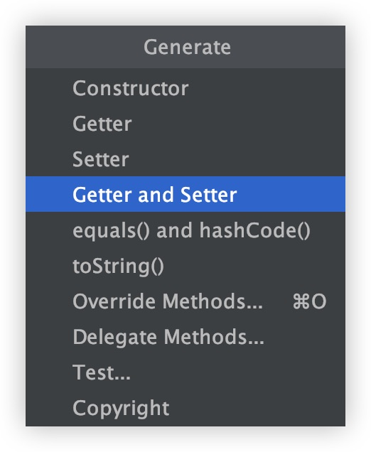 与Eclipse类似,在定义好类的私有属性后,使用快捷键:Alt + Insert