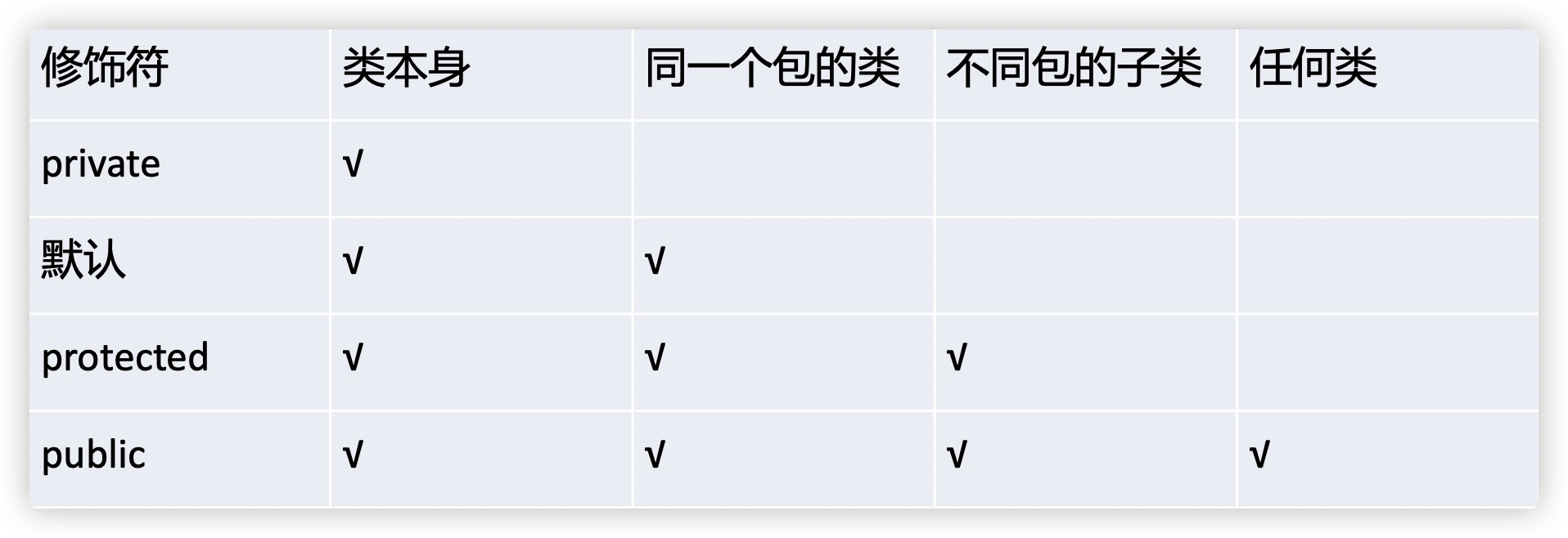 - 默认:同包可访问权限,在没有声明权限修饰符时为默认权限,允许在同包的其他类访问