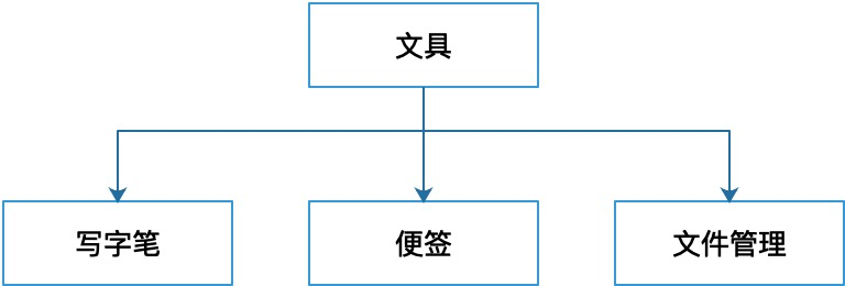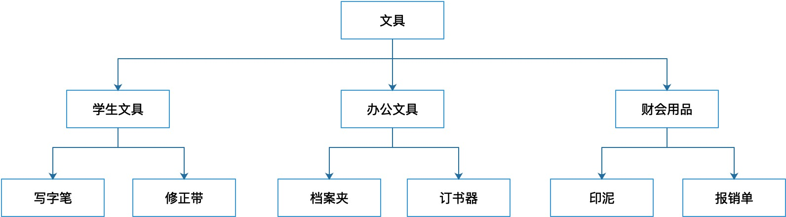 如果品类更加的复杂,可以先分为:学生文具、办公文具、财会用品,然后在每个品类下面再根据具体的作用去划分。这些被划分出来的子类别都一定具有父类别的某些共同特征或用途,并且有可能存在多级的分类关系,那么如果我们使用面向对象的语言去描述出这样一种关系就可以使用继承。