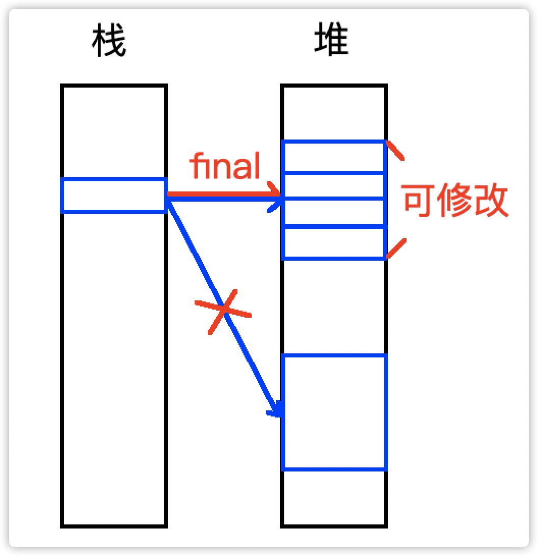 当修饰属性时,如果是基本数据类型,则可看做是定义了一个常量,值一旦被指定则不可变。如果是引用类型,则引用无法发生变化,即:可以修改数组或实例中的属性值,但是引用的指向不能再发生变化,无法再指向其他的实例和数组。