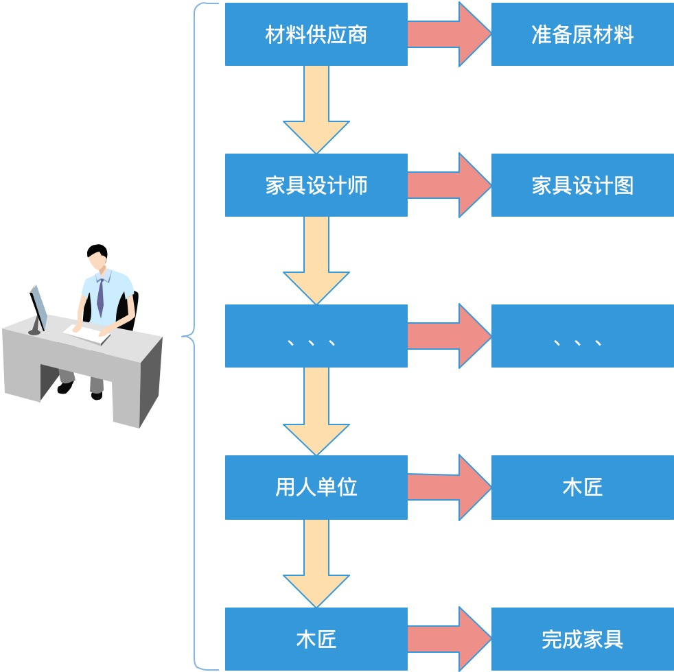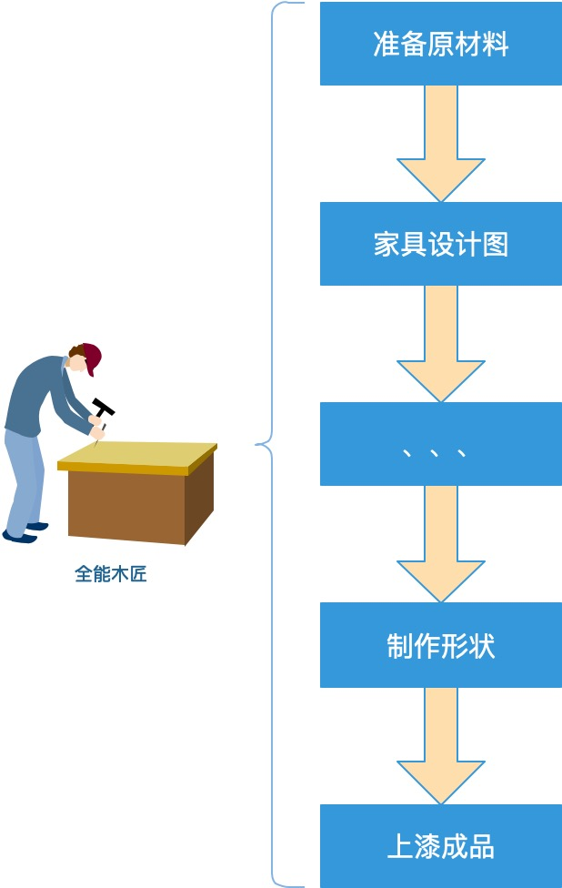 原材料准备,这应该是采购商的工作,其他的环节他无需插手;家具设计图,这是设计公司的工作;找到合适的木匠,这是用人单位应该做的。谁来做家具呢?木匠。于是我们把这些人组合到一起就可以完成这样一个工作,编程者更像是一个项目的负责人,需要知道完成这项工作需要用到哪些人,这些人应该能够完成哪部分的工作,每个人各司其职。