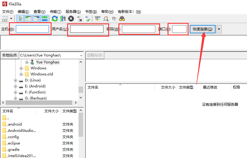 打开FileZilla,输入以下四个信息,点击链接,端口一般为22