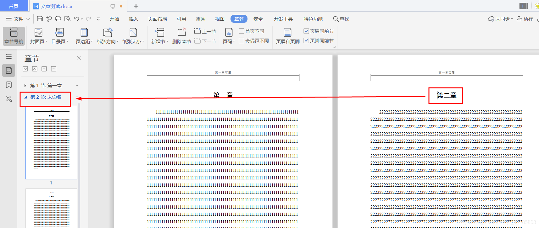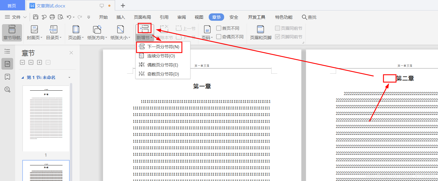 2、首先将鼠标定位到第二章前边,依次点击章节→新增节→下一页分节符
