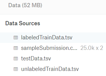 - labeledTrainData - The labeled training set. The file is tab-delimited and has a header row followed by 25,000 rows containing an id, sentiment, and text for each review. 文件以制表符分隔,头行后面跟着25000行,每行包含id、情绪和文本。