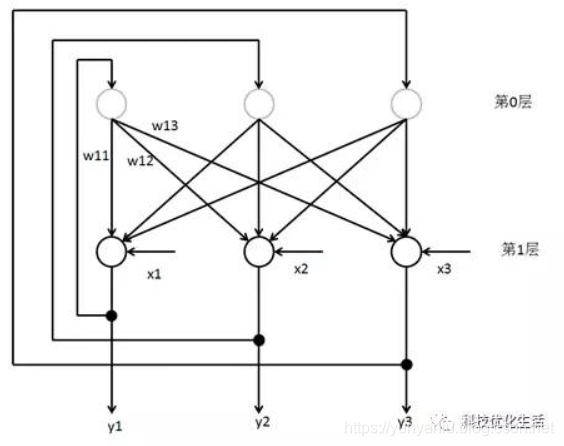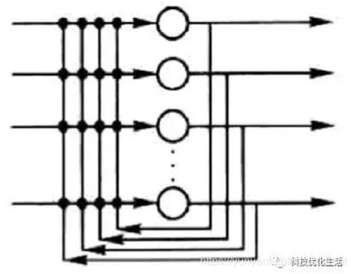 Hopfield神经网络是一种循环神经网络,每个节点的输出都是其他节点的输入(但不存在自反馈),下边的T代表阈值(类似NN的偏置)。Hopfield网络是一种结合存储系统和二元系统的神经网络。它保证了向局部极小的收敛,但收敛到错误的局部极小值(local minimum),而非全局极小(global minimum)的情况也可能发生。Hopfield网络也提供了模拟人类记忆的模型。