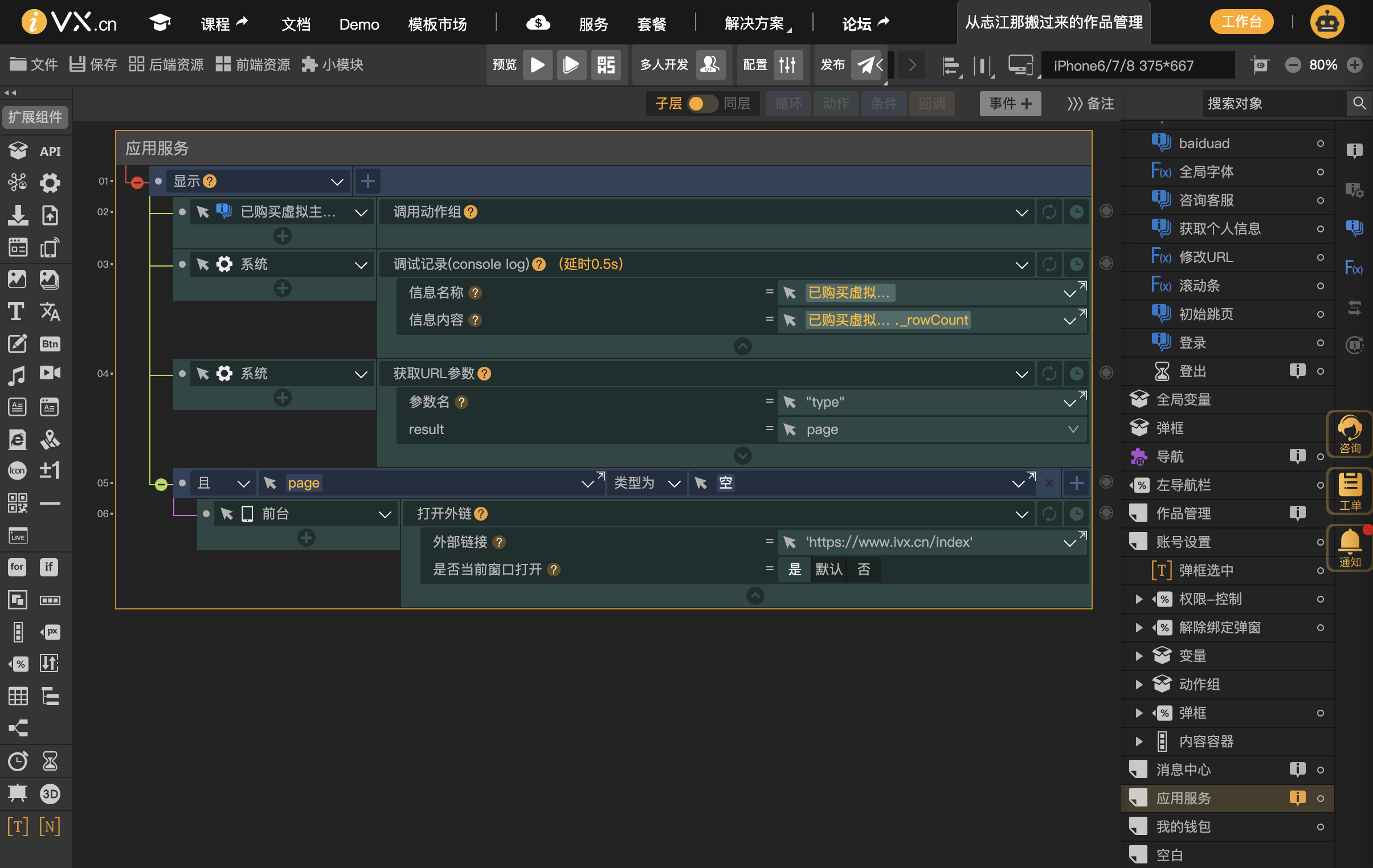 触发式的逻辑编写,每个对象后面都可以添加逻辑。支持“循环” “分支” “回调” “延迟”调用等。如果想看,已经开发的项目,可以简单查看 www.ivx.cn/videocenter (有一些解决方案在上面)。如果是程序员(无论前端后台还是iOS或其它)学习这套全新的开发方式,非常迅速,几天就可以上手,因为开发逻辑和方式几乎一摸一样。