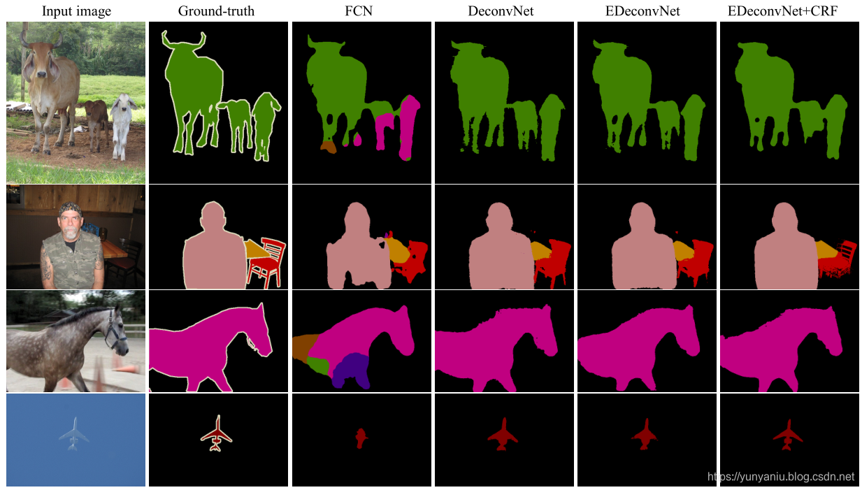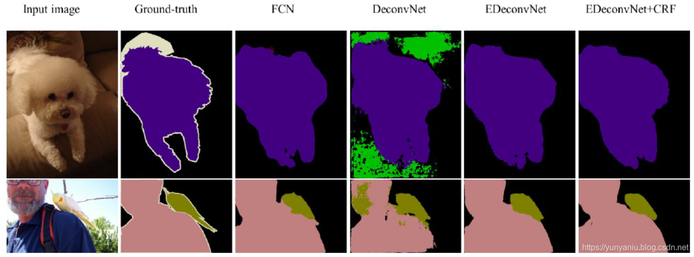 下图展示了FCN算法优于DeconvNet算法(因为多出了一些细节),同样的,EDeconvNet+CRF后处理的算法(效果更好!)