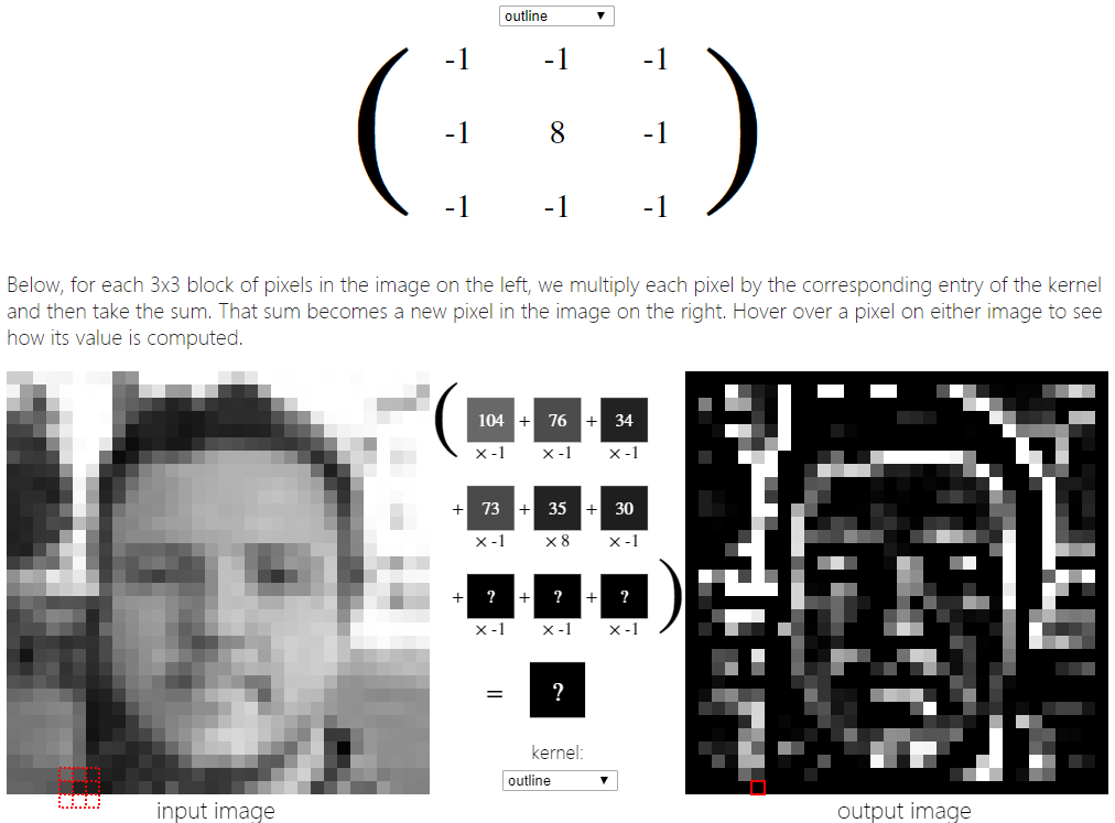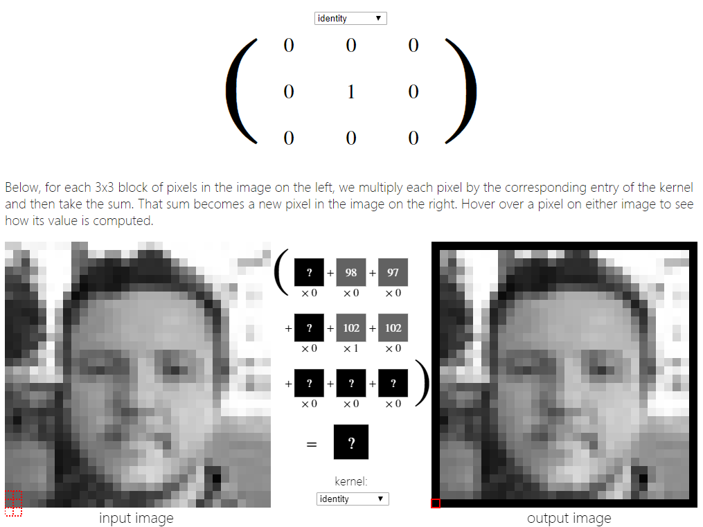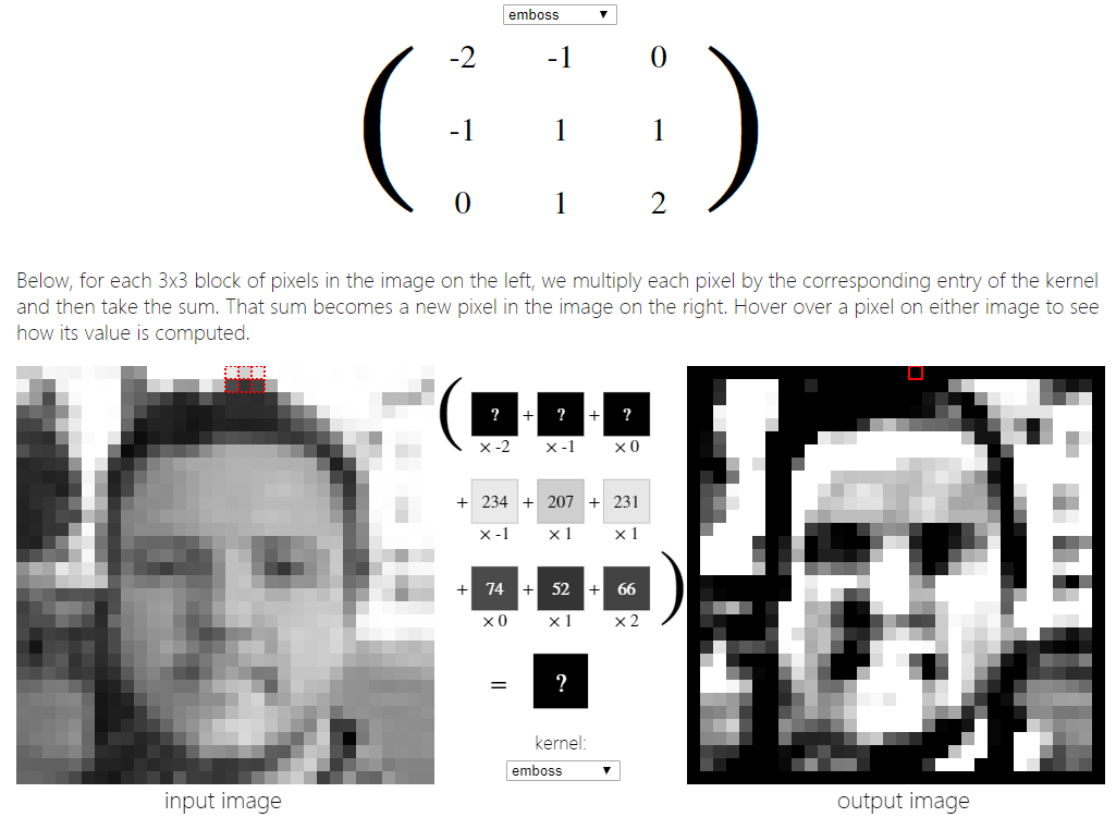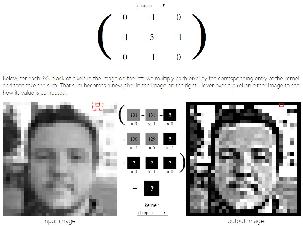 接下来,看看如何将下面的3x3锐化内核应用到上面的一张脸的图像上。下面,对于左边图像中每3x3个像素块,我们将每个像素乘以核中对应的项,然后求和。这个和就变成了右边图像中的一个新像素。将鼠标悬停在图像上的一个像素上,看看它的值是如何计算的。