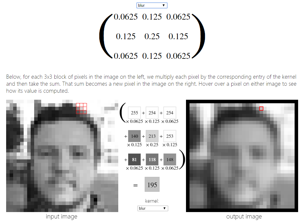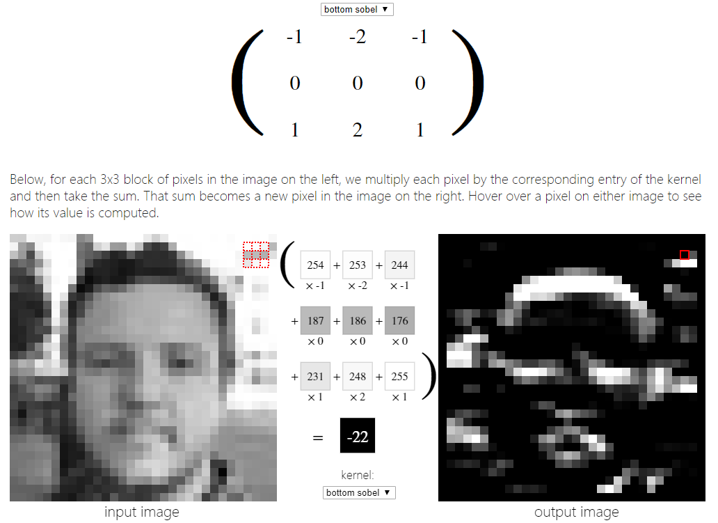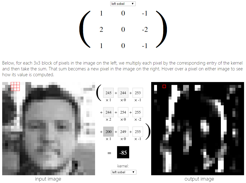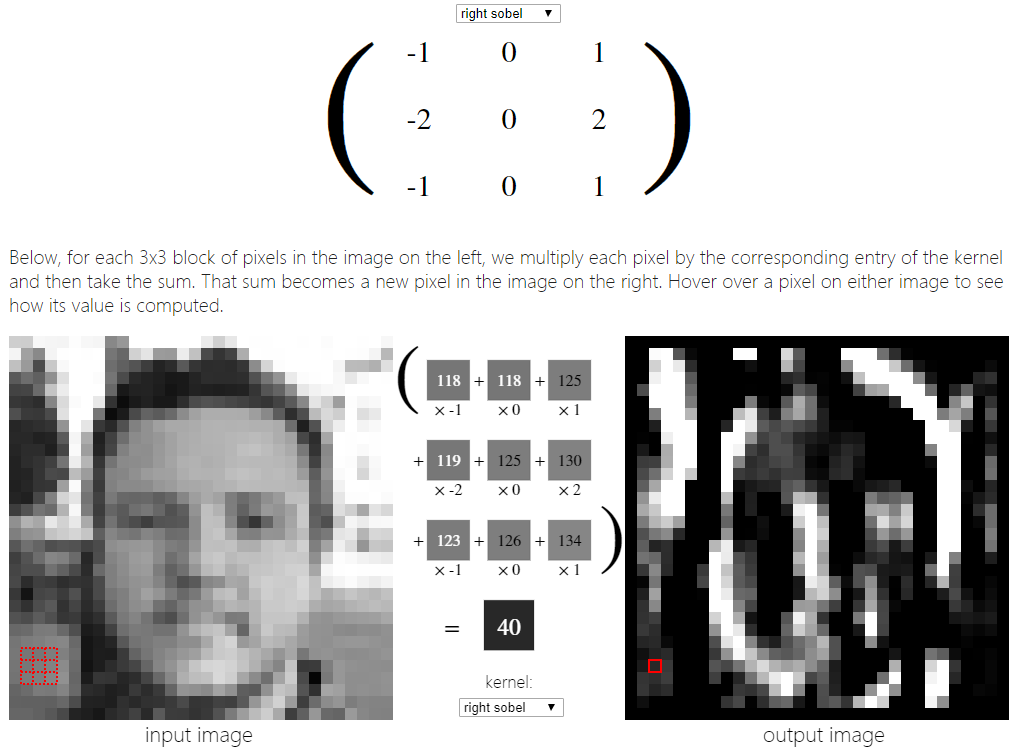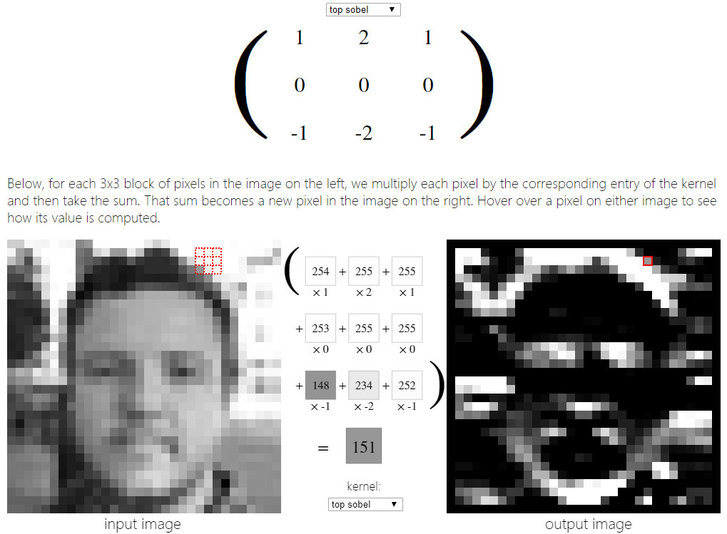 接下来,看看如何将下面的3x3锐化内核应用到上面的一张脸的图像上。下面,对于左边图像中每3x3个像素块,我们将每个像素乘以核中对应的项,然后求和。这个和就变成了右边图像中的一个新像素。将鼠标悬停在图像上的一个像素上,看看它的值是如何计算的。