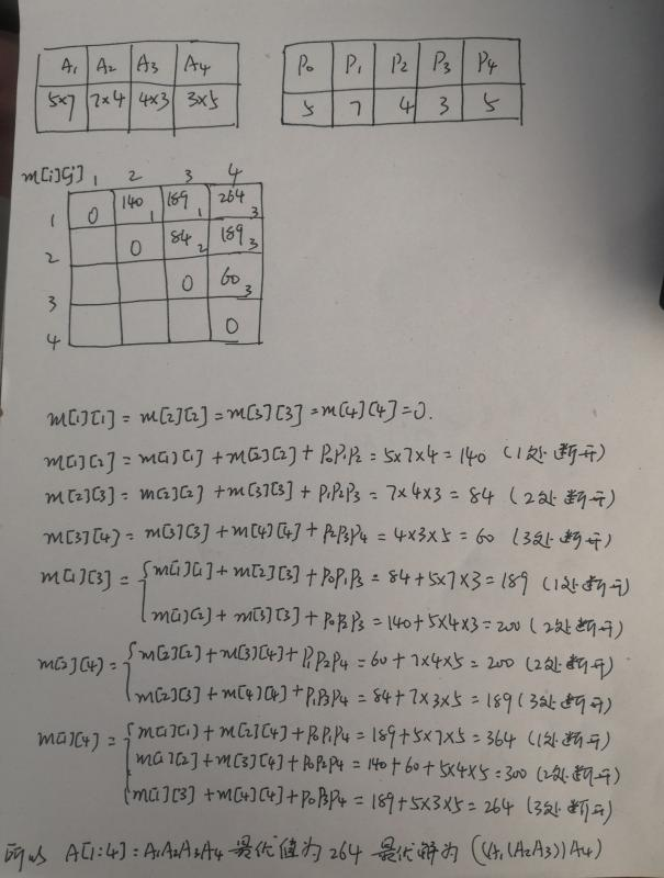 - 求矩阵链A1A2A3A4的最优运算次序。其中矩阵Ai的大小为pi-1×pi。其中P(0) = 5,P(1) = 7,P(2) = 4,P(3) = 3,P(4) = 5