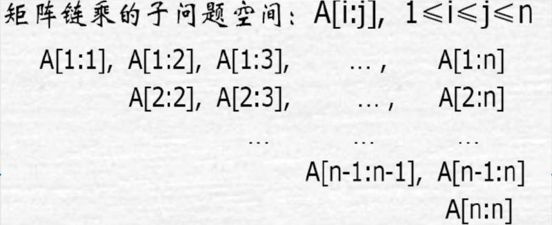 - 设计算A[i:j],1≤i≤j≤n,所需要的最少数乘次数m[i,j],则原问题的最优值为m[1,n]