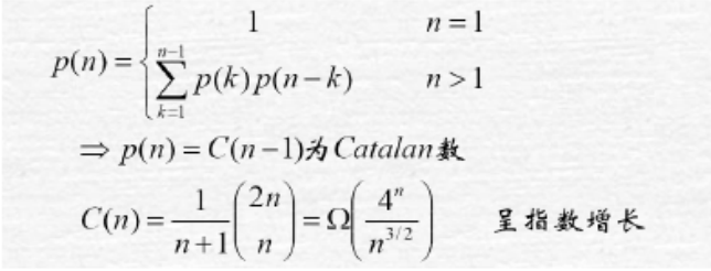 - 复杂性分析: 用p(n)表示n个矩阵链乘的穷举法计算成本,如果将n个矩阵从第k和k+1出隔开,对两个子序列再分别加扩号,则可以得到下面递归式: